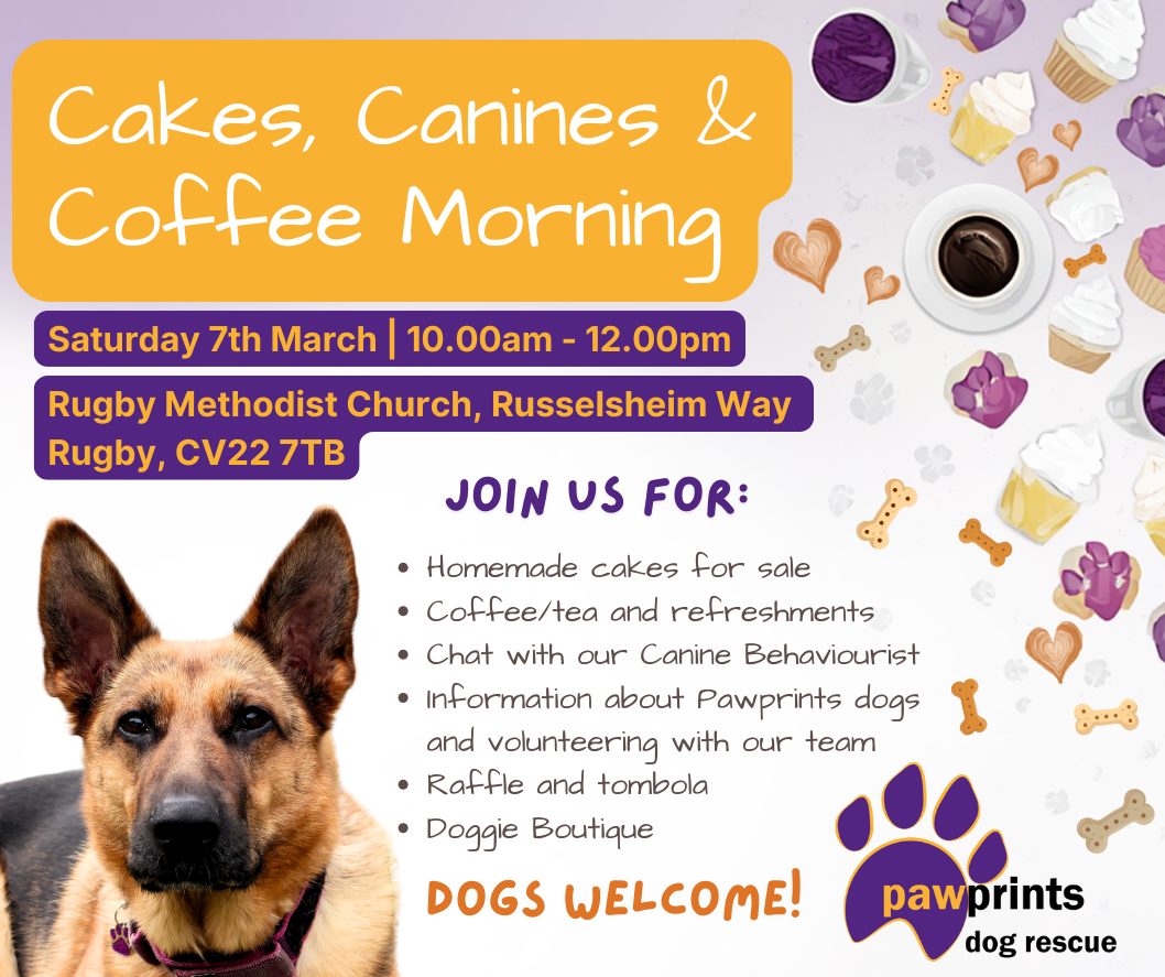 Join us for a cuppa and cake on Saturday 7th March for our Spring Coffee Morning at Rugby Methodist Church. Chat with our canine behaviourist, mingle with volunteers and have a go on our Tombola and fundraising games!